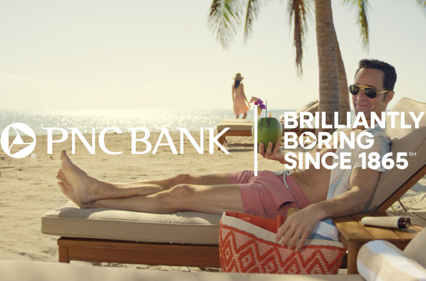 “冒险是滑板和加油站寿司的事——而不是银行。这就是为什么PNC银行努力让你的钱变得无聊,”这位演员说。喝着顶上放着菠萝片和纸伞的椰子,他总结道:“谢谢你,无聊。”