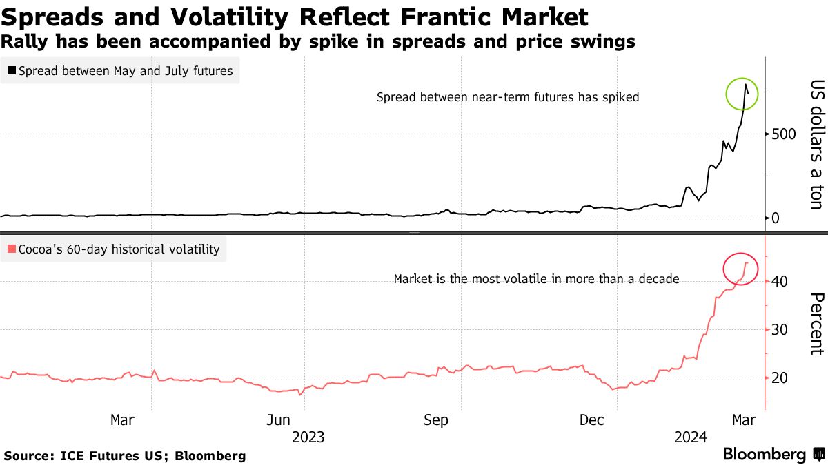 疯狂的交易在期货的价差和波动性中显而易见。5月合约相对于7月期货的溢价从2月份的不到100美元飙升至800美元以上,这表明对近期供应紧张的担忧。可可的上涨也伴随着更大的价格波动,波动性指标达到了十多年来的最高水平。