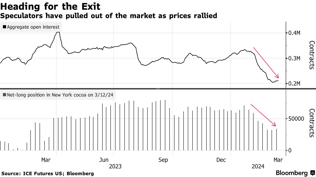 尽管可可价格上涨,投机者实际上已经退出市场。未平仓合约数量从1月底的高峰下降了约三分之一。同时,资金经理将其净多头押注削减了近一半,最新数据显示。