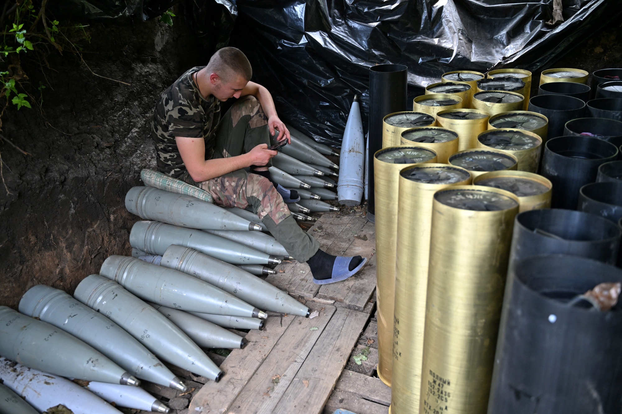 一名乌克兰炮兵在顿涅茨克地区的一个阵地上休息。