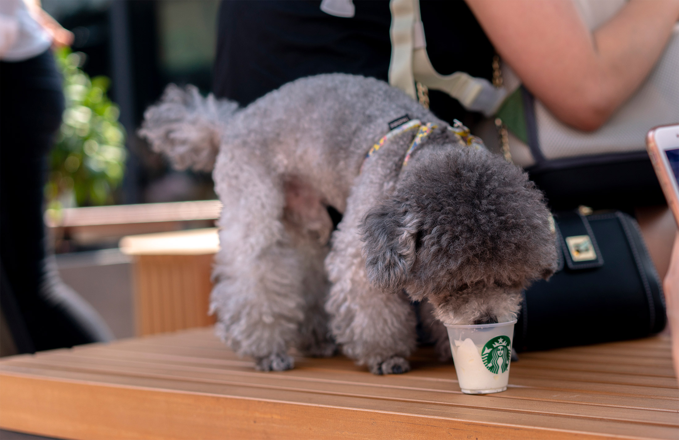 一只贵宾犬在中国天津的宠物友好型星巴克享用冰淇淋。