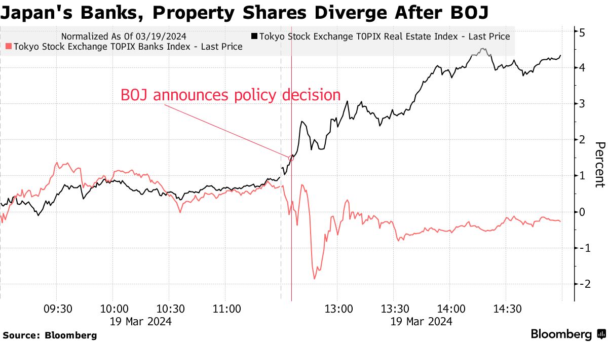 日本房地产股票在日本银行加息后飙升,银行股下跌 - 彭博社