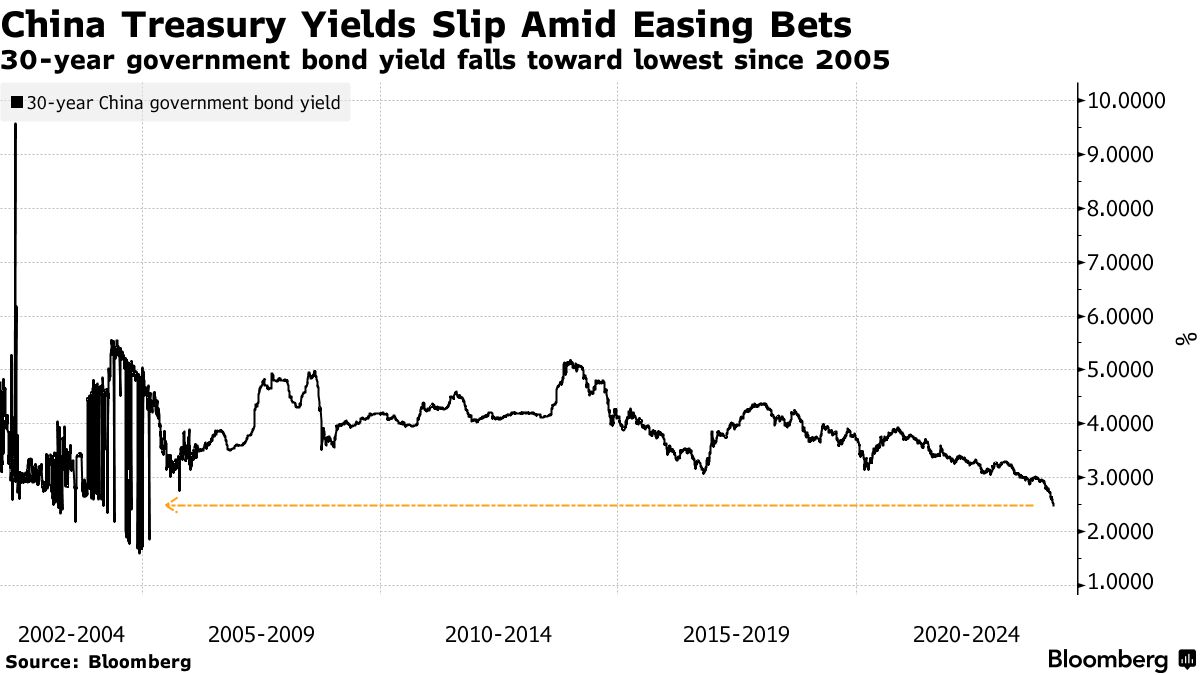根据彭博社汇编的数据,30年期政府债券的收益率连续第三天下滑,接近自2005年以来的最低水平。这一反弹发生在一个交易者权衡中国计划增加超长期主权债券发行的市场中,以及在疲弱经济背景下,中央银行进一步货币宽松的前景。