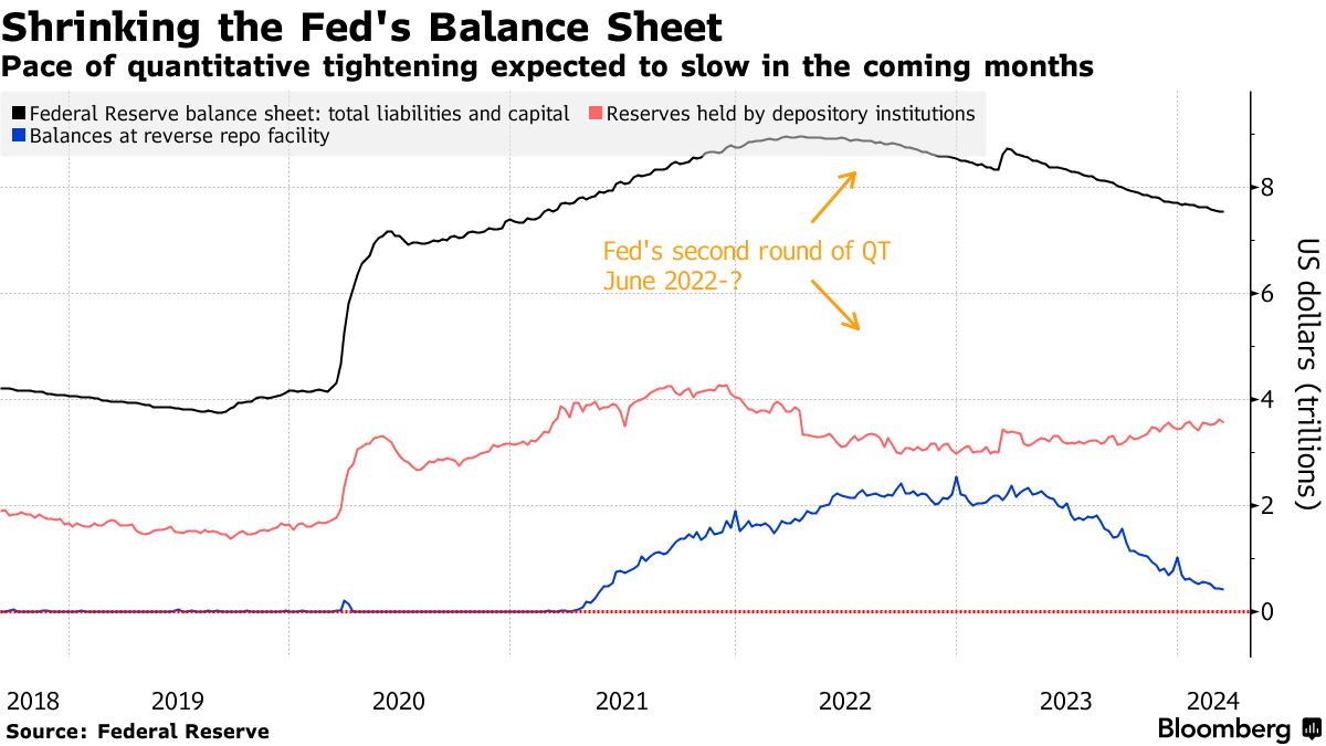 一旦QT减缓开始,一些人认为美联储可能会继续缩减其资产负债表,直到2025年。然而,这将取决于储备的最佳水平——一个未知的点,在这个点上,金融系统有足够的流动性,隔夜市场利率保持稳定。