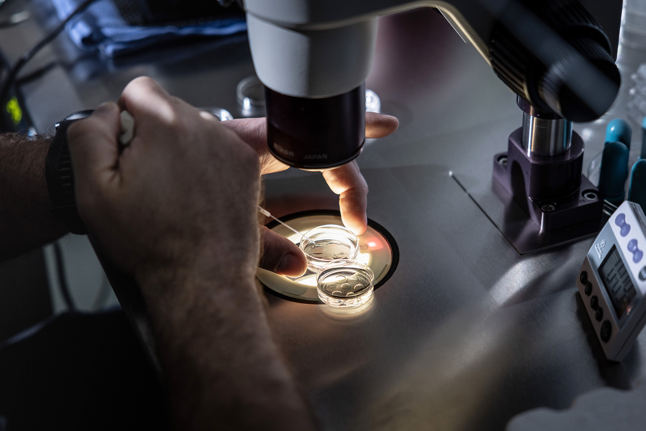 一位高级胚胎学家在加利福尼亚州泉谷的西海岸生育中心向含有胚胎的培养皿中添加培养基,然后进行冷冻,时间是在二月份。