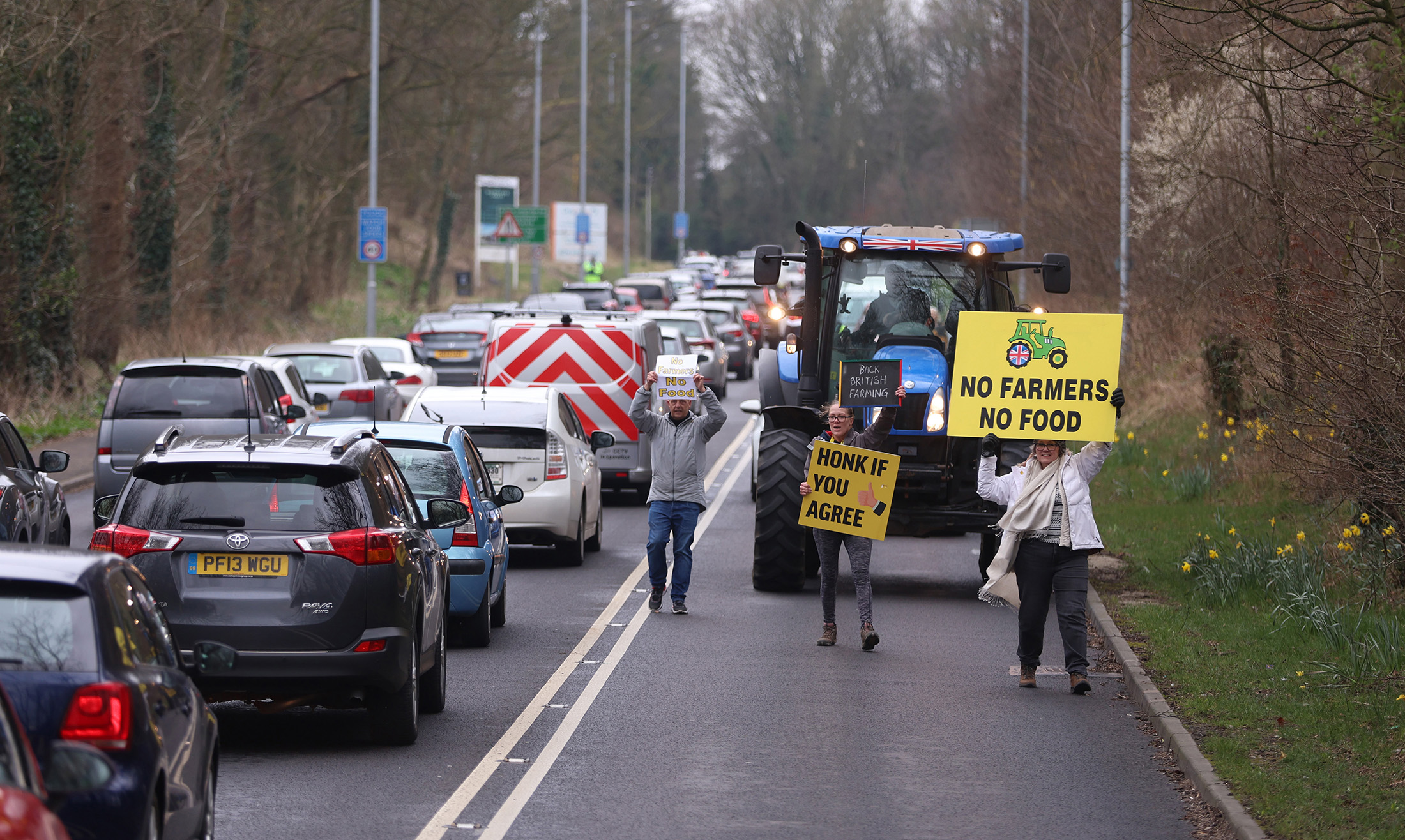 农民在英格兰普雷斯顿抗议时举着标语牌,日期为3月10日。