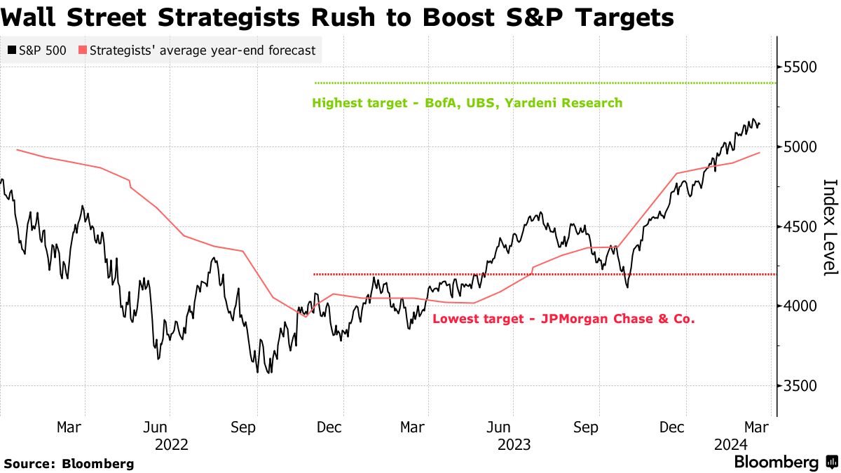标准普尔500指数今年首次突破了重要的5100里程碑,该指数已经超过了4962的年末平均预测。基准指数在2023年上涨24%后,今年初上涨近8%,使华尔街争论股市是否会出现反转。