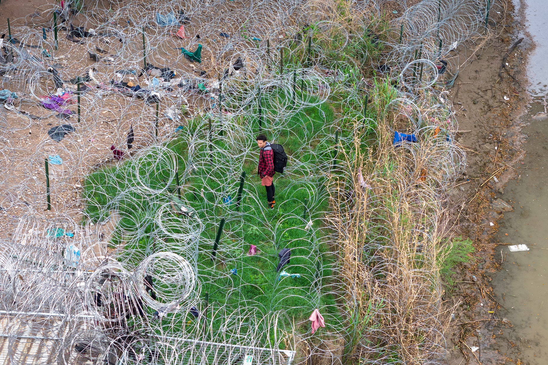 一名移民在3月17日于德克萨斯州鹰通过里奥格兰德河后,面对缠绕的剃刀铁丝。
