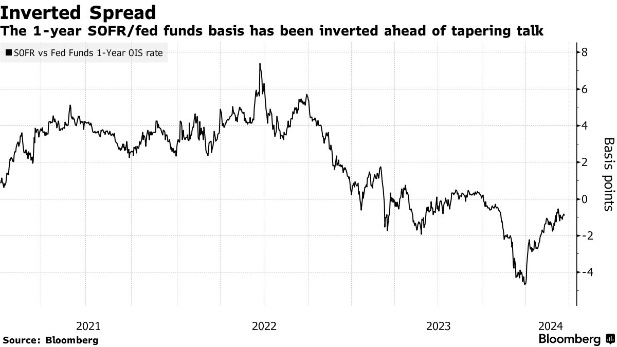 随着储备减少,预计有效联邦基金利率与与回购相关的担保隔夜融资利率之间的差距最终会扩大。根据纽约联邦储备银行周三发布的数据,截至3月19日,SOFR固定在5.31%。