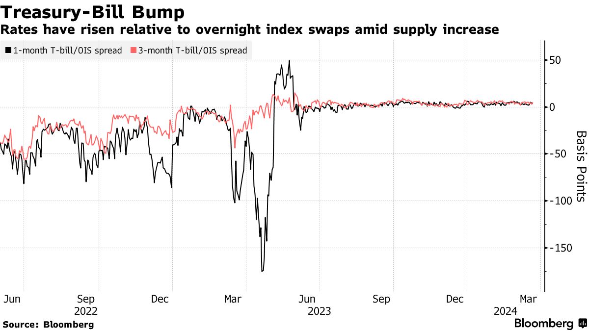 这种影响在国库券相对于其他无风险利率(如隔夜指数掉期)的定价中得到了体现。证券的收益率终于超过了OIS,但狭窄的差距表明对短期政府债务的需求仍然强劲。