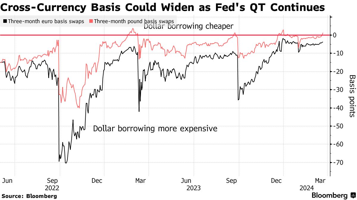 除了美国本土的工具,外汇掉期市场可能会受到美联储资产负债表缩减的影响。与欧元和英镑相关的跨货币基差掉期可能会扩大,因为美国的储备余额预计将比欧洲中央银行和英格兰银行的超额流动性下降得更快。