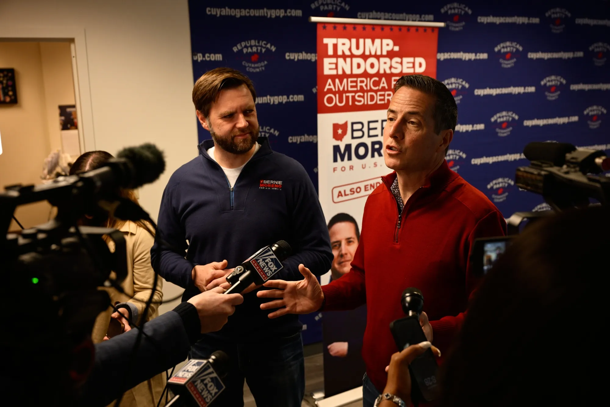 伯尼·莫雷诺(右)在3月19日俄亥俄州的一次活动中与JD·范斯站在一起发言。摄影师:达斯汀·弗朗茨/彭博社他在周二的初选中击败了州参议员马特·多兰和俄亥俄州国务卿弗兰克·拉罗斯,经过了一场竞争激烈且充满争议的初选。
