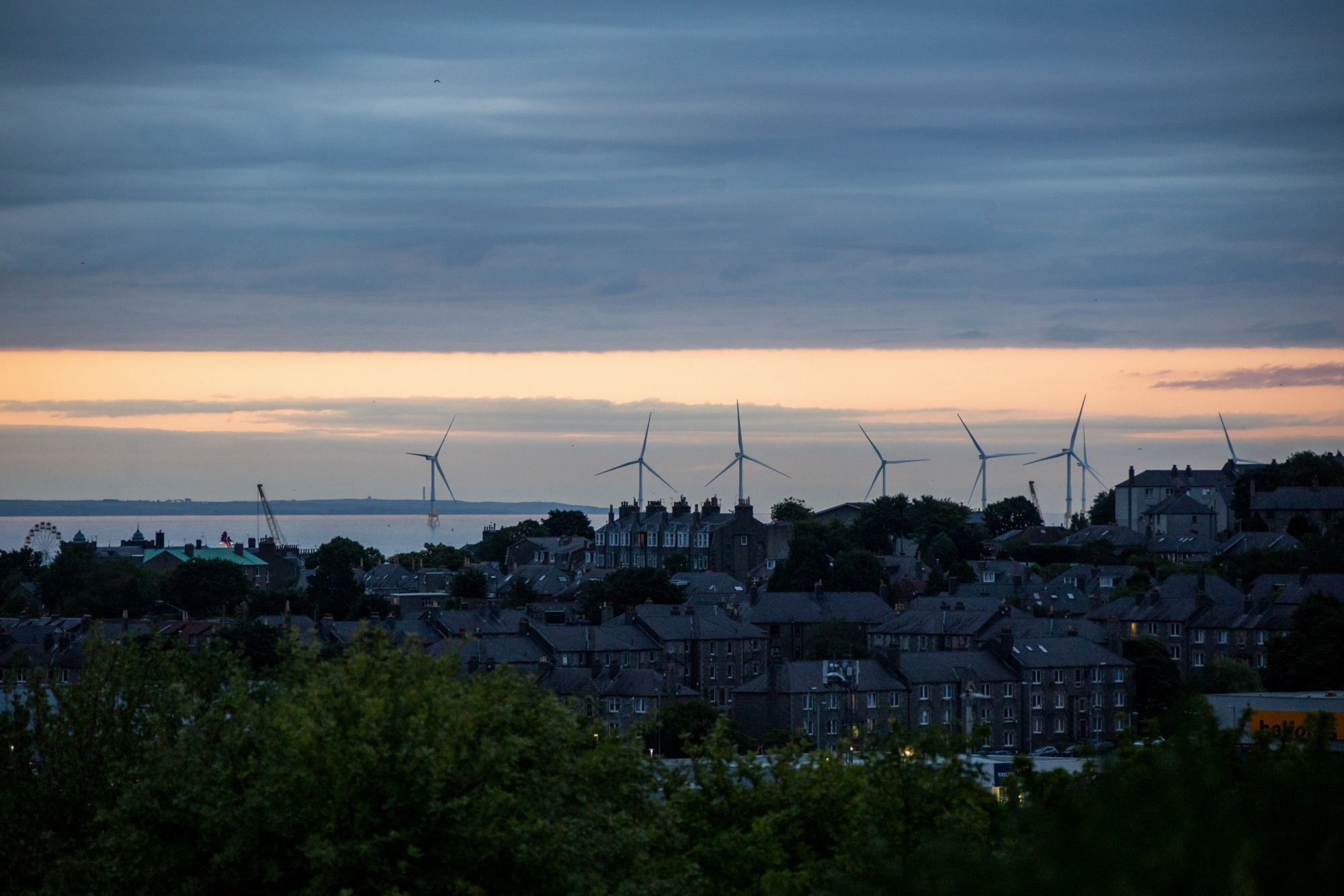 苏格兰阿伯丁沿海住宅旁的海上风力涡轮机。摄影师:艾米莉·麦金尼斯/彭博社