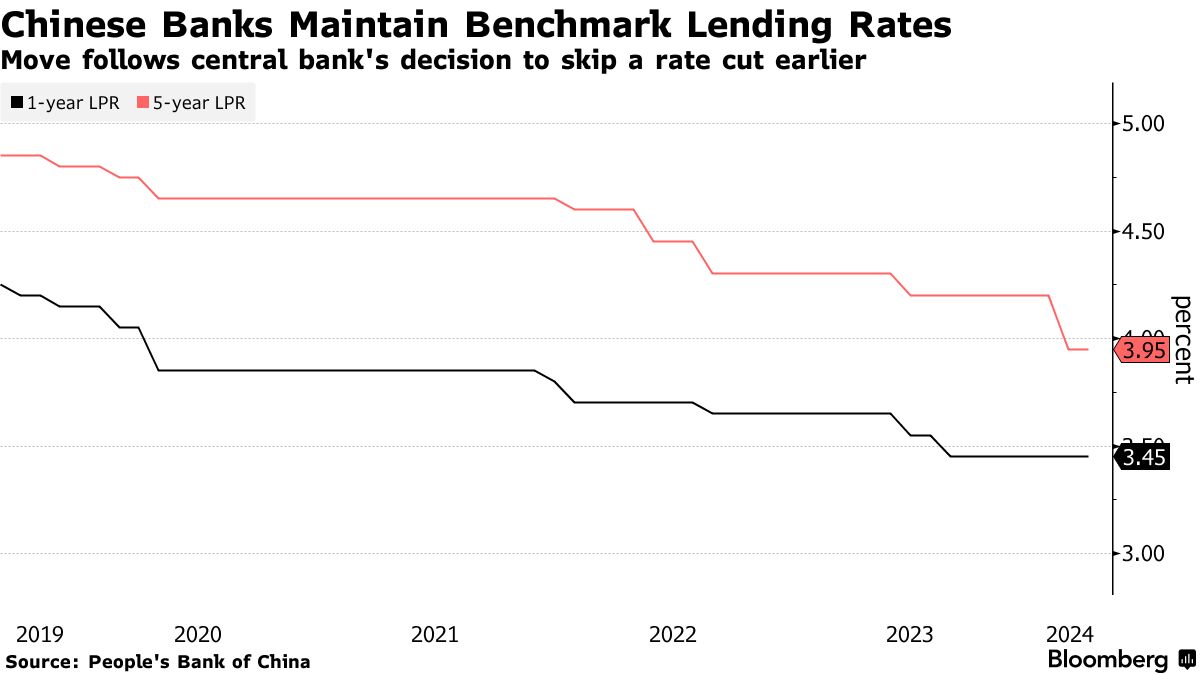 一年期贷款市场报价利率周三保持在3.45%,与彭博社调查的22位经济学家中几乎所有人的预测一致。根据中国人民银行的数据,五年期利率,即抵押贷款的参考利率,也按预期保持在3.95%。