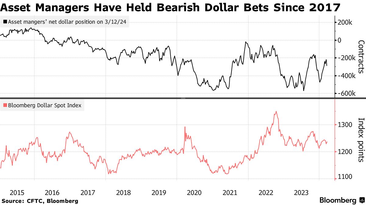 自2017年以来,资产管理者一直坚持押注美元将下跌,这增加了如果这些押注失误,可能出现剧烈趋势反转的风险。华尔街策略师们还预计,到今年年底,几乎所有十国集团货币都将对美元升值,欧元将升至约1.10,日元为139。