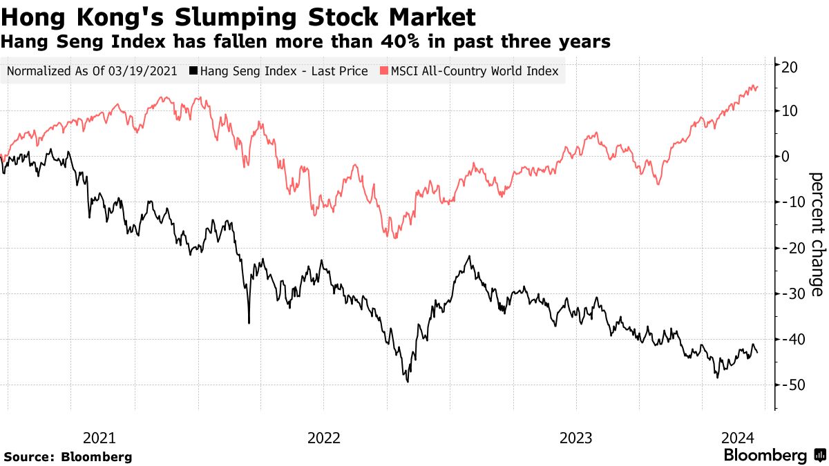 香港恢复吸引力的需求变得紧迫。其房地产市场正处于下行螺旋,去年住宅销售降至近三十年来的最低点,办公楼空置率创下历史新高。当地股票基准恒生指数在过去三年中下跌超过40%,而MSCI Inc.的全球股票指数则上涨了15%。