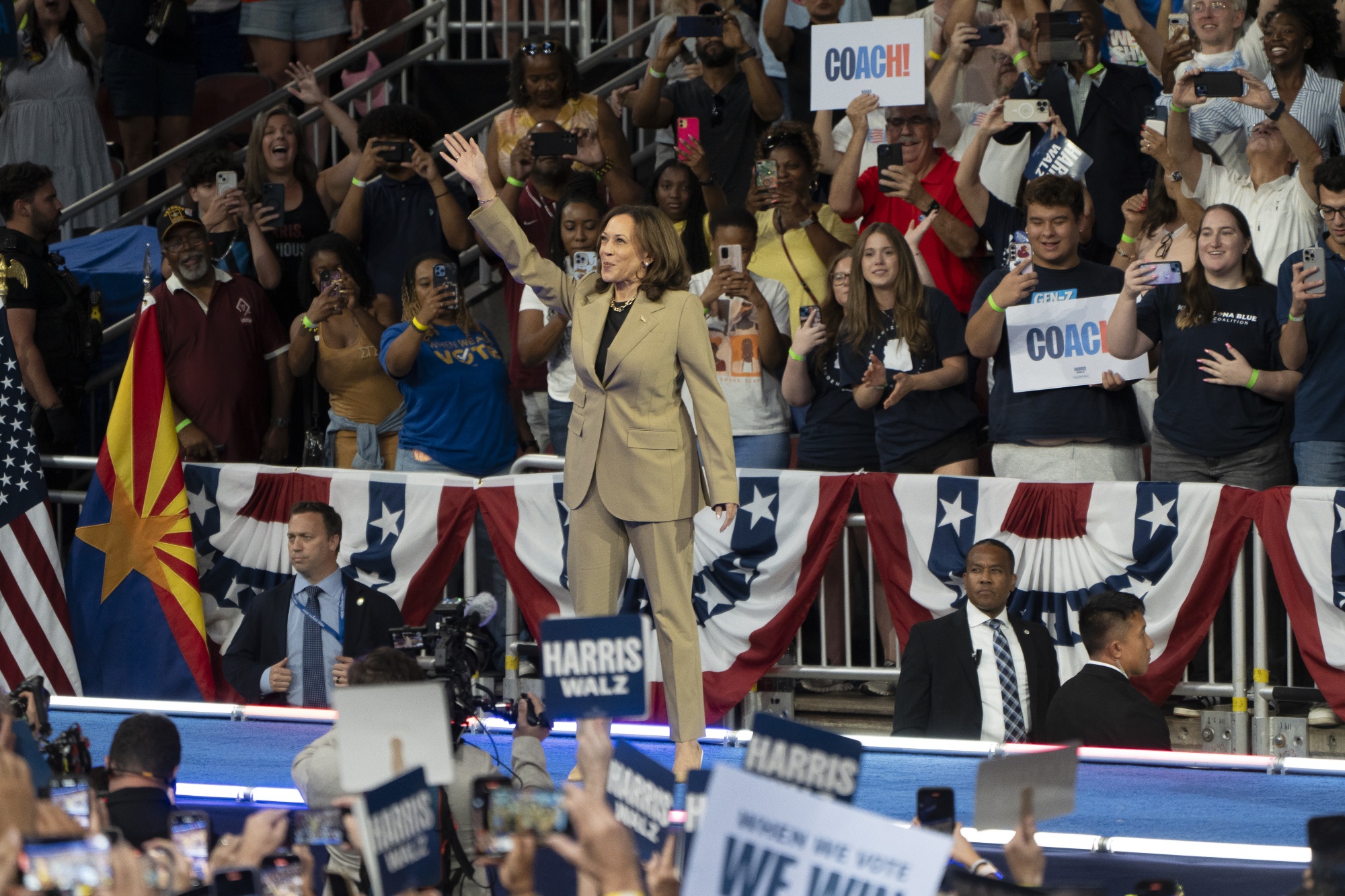 卡马拉·哈里斯在美国亚利桑那州凤凰城的一个竞选活动中挥手,时间是8月9日。