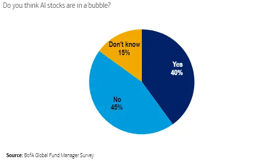关于股票的最后一点警告,可能几乎是看涨的:美国银行直接询问人工智能股票是否处于泡沫中。因为其他人也在问这个问题,所以这很有道理。结果发现,大资金的管理者和我们一样无知。他们几乎正好一半一半: