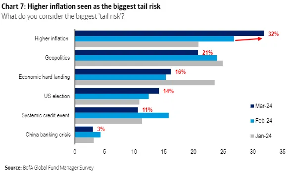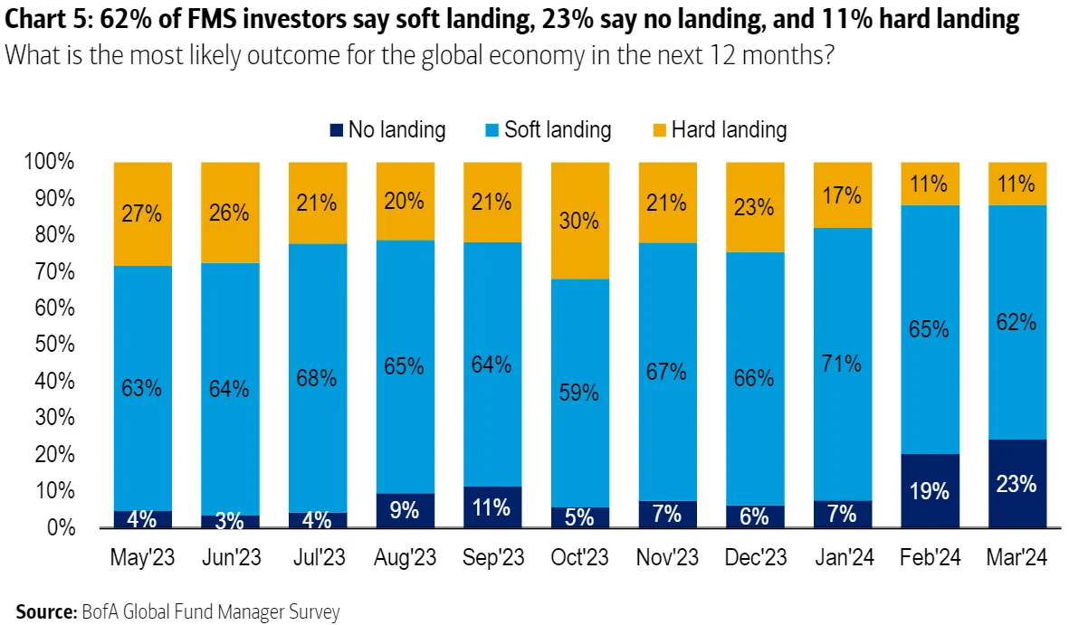 在一月份,基金经理们担心地缘政治和经济硬着陆的可能性,这是一个自然的环境,预计利率和通货膨胀会下降。现在,他们最大的担忧,远远超过其他,是更高的通货膨胀。这种心理本身可能使美联储更难进行激进的降息。当经理们被问及对“无着陆”——一个经济强劲增长并使降息变得更加困难的流行术语——或软着陆或硬着陆的可能性进行下注时,这一点也得到了体现。“无着陆”的机会从六月份的3%上升到现在的23%。硬着陆的几率现在为11%,去年十月曾高达30%: