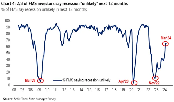 最后一个令人震惊的数据点是,现在三分之二的人认为在未来12个月内出现衰退的可能性不大。这是自2022年初美联储加息以来的最高水平: