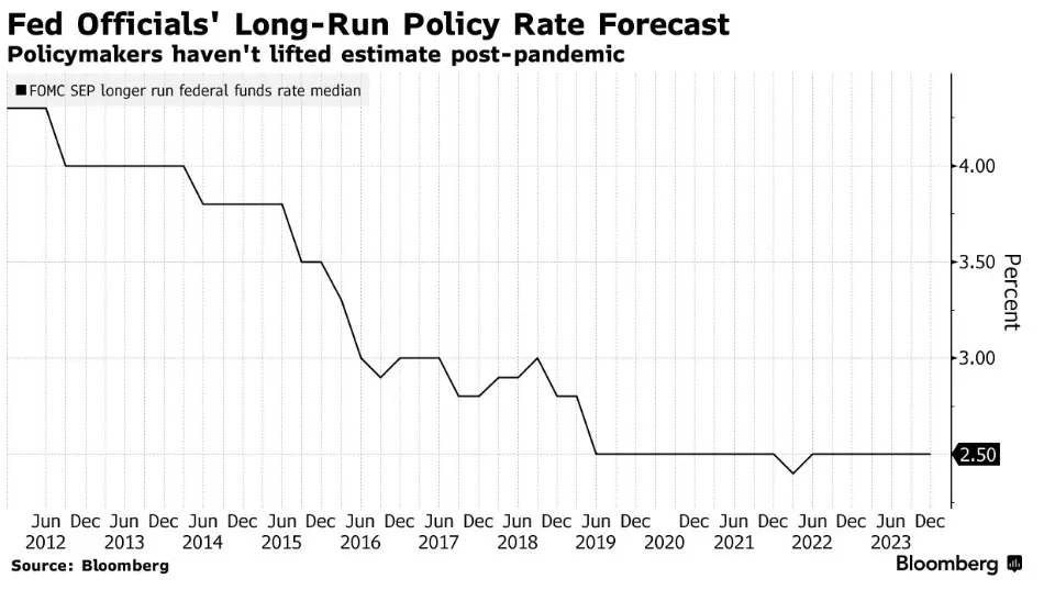 一些美联储观察者警告说,要关注一个很少受到关注的预测:基准利率的“长期”预测。这一预测已经保持在2.5%多年了。但一些著名经济学家得出的结论是,美国经济可能不会回到疫情前的超低利率时代。