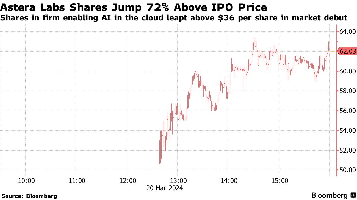 Astera Labs Inc.在其首次公开交易中暴涨72%,这家半导体连接公司的首次公开募股超过预期,筹集了7.13亿美元,为人工智能相关股票和上市复苏增添了动力。
