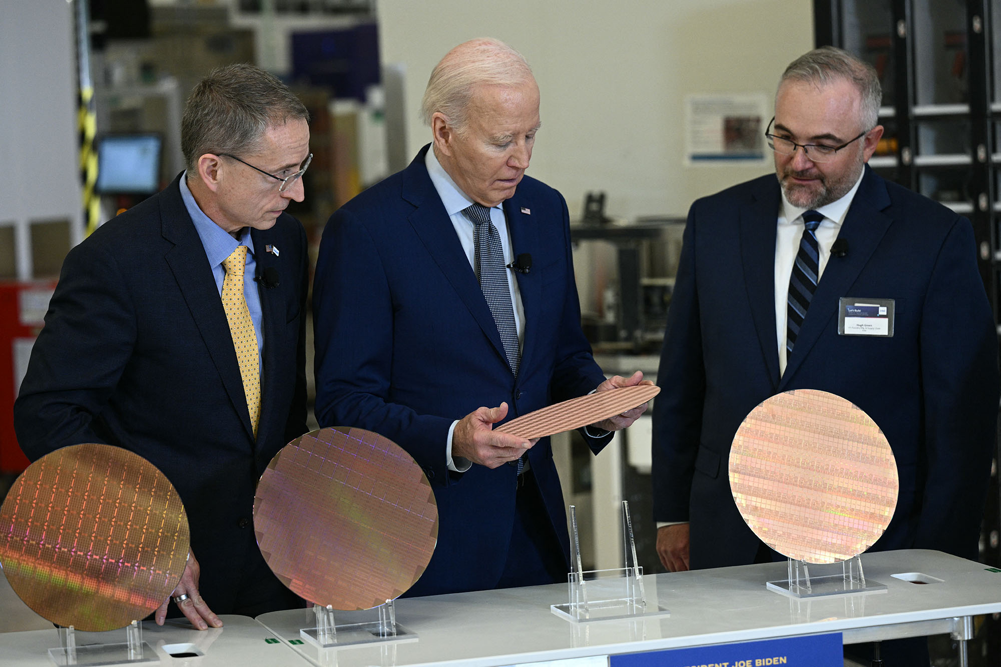 乔·拜登与帕特·盖尔辛格在亚利桑那州钱德勒的英特尔奥科蒂洛校园观看硅晶圆,时间是3月20日。摄影师:Brendan Smialowski/AFP/Getty Images### 1000亿美元投资