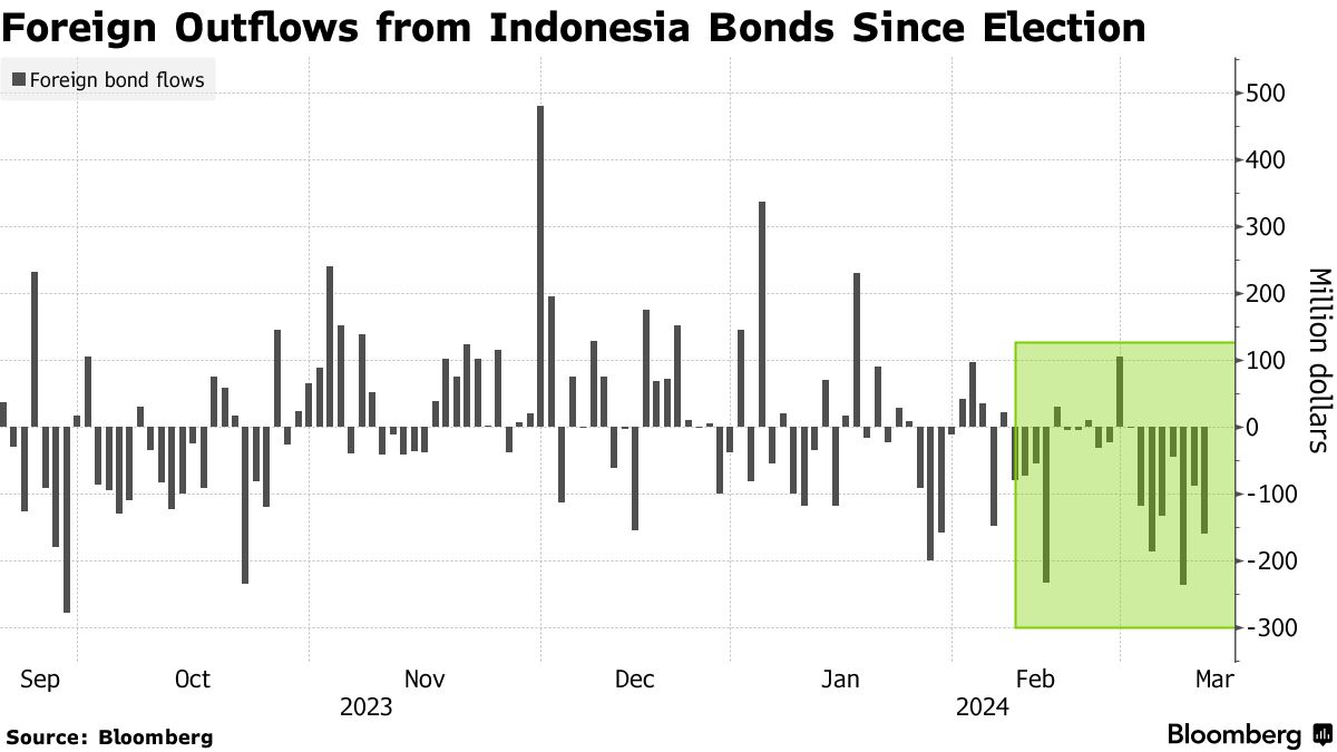 自2月14日投票结束以来,全球基金已经从印尼债券中撤出了11亿美元,自那时起的20天中有16天出现了净外国债券流出。与此同时,地区同行韩国和印度看到了境外资金流入,而泰国在同一时期仅观察到5.02亿美元的流出。