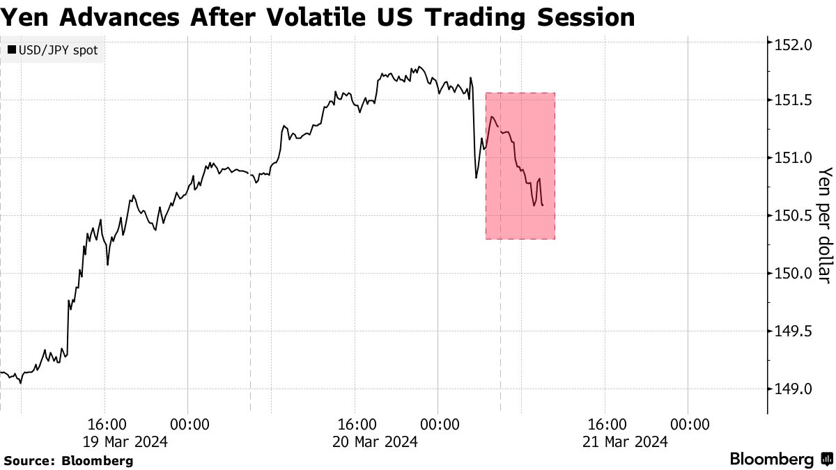 随着日元兑美元汇率从周三触及的151.82的最弱水平上涨至150.27,日元升值了0.7%。在美联储维持本年度三次降息预期并主席杰罗姆·鲍威尔表示适当减少政策限制后,美元普遍下跌,日元出现反弹。保持其对本年度三次降息的预期,鲍威尔表示适当减少政策限制。
