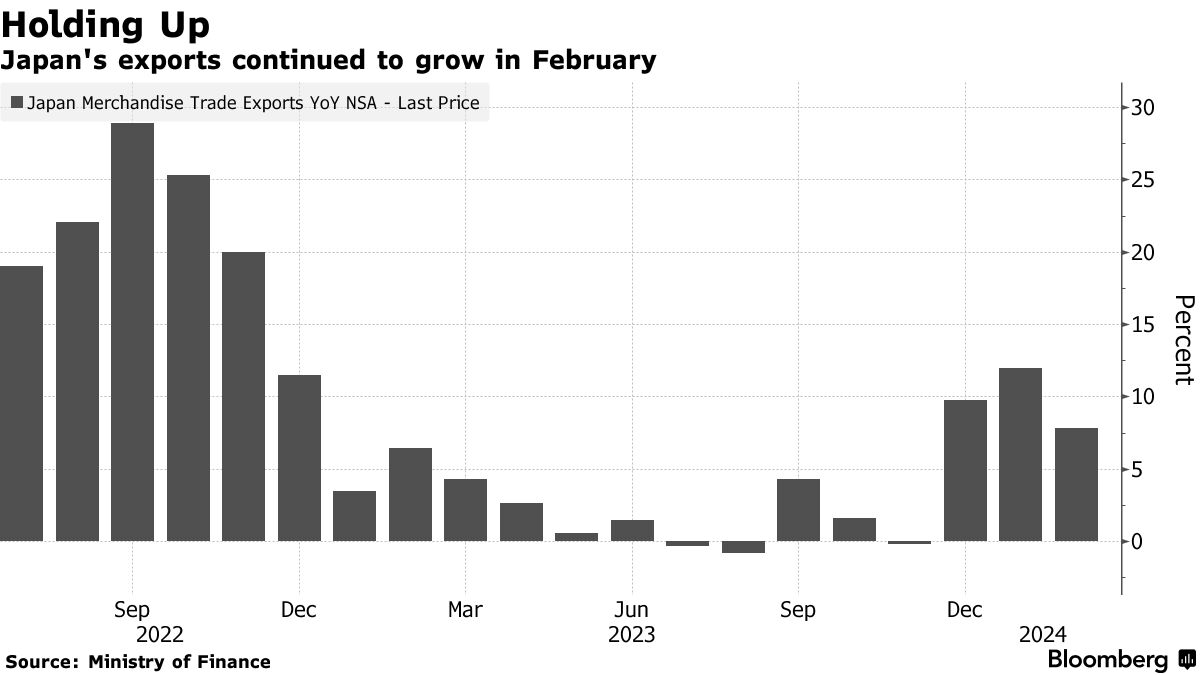 日本出口商正在关注其主要海外市场的需求前景。美联储表示将坚持其计划,今年削减利率三次,以期在多年抗击通货膨胀后实现软着陆。中国年初强劲的工厂产出和投资增长提高了日本出口商的希望。
