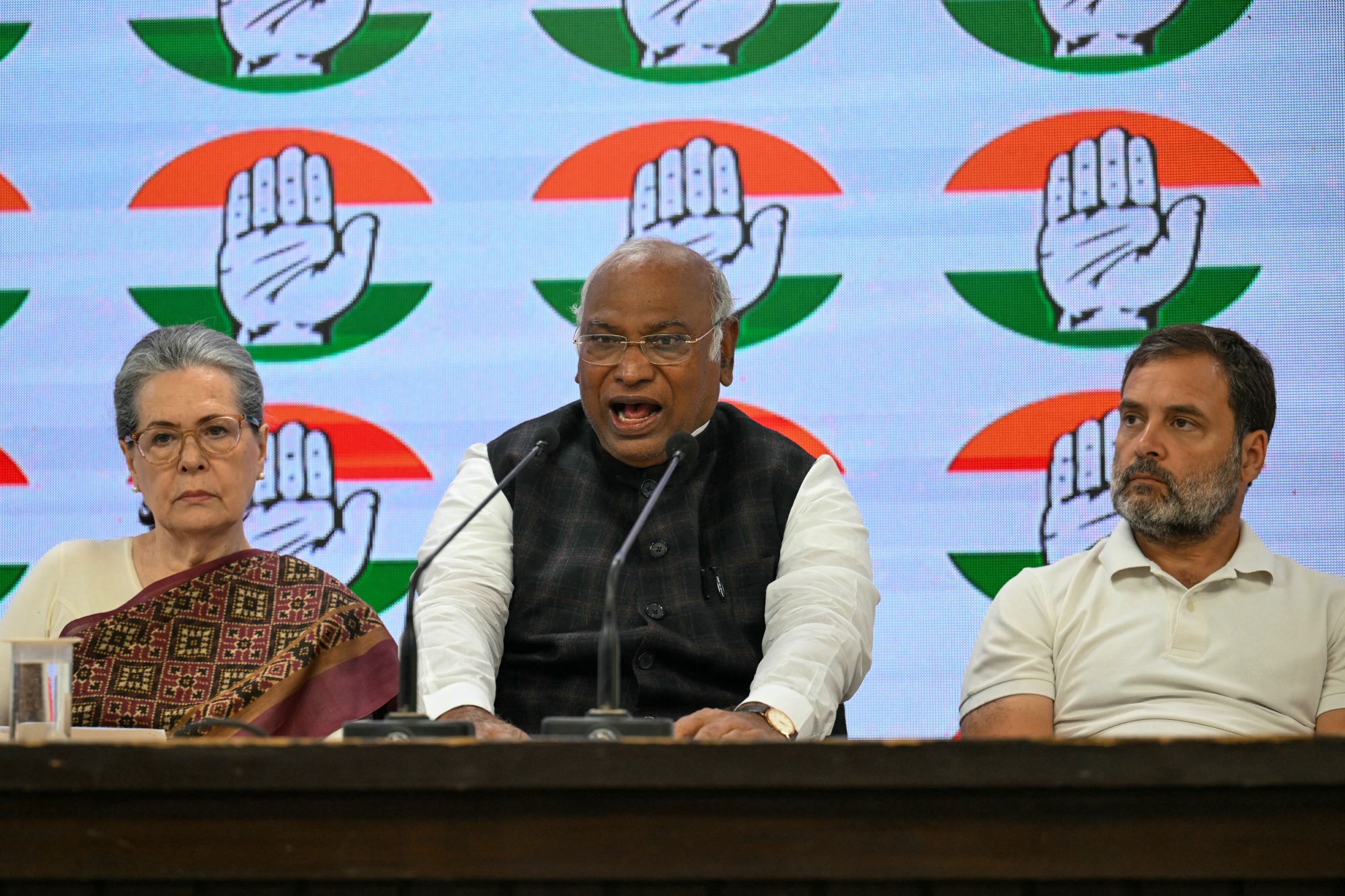 印度国大党主席马利卡尔琼·卡尔格(Mallikarjun Kharge)中间,左边是索尼娅·甘地(Sonia Gandhi),右边是拉胡尔·甘地(Rahul Gandhi),他们在3月21日于新德里国大党总部合影。摄影师:Arun Sankar/AFP/Getty Images订阅印度版新闻简报,由Menaka Doshi撰写 - 一份关于新兴经济强国、背后的亿万富翁和企业的内幕指南,每周发送。