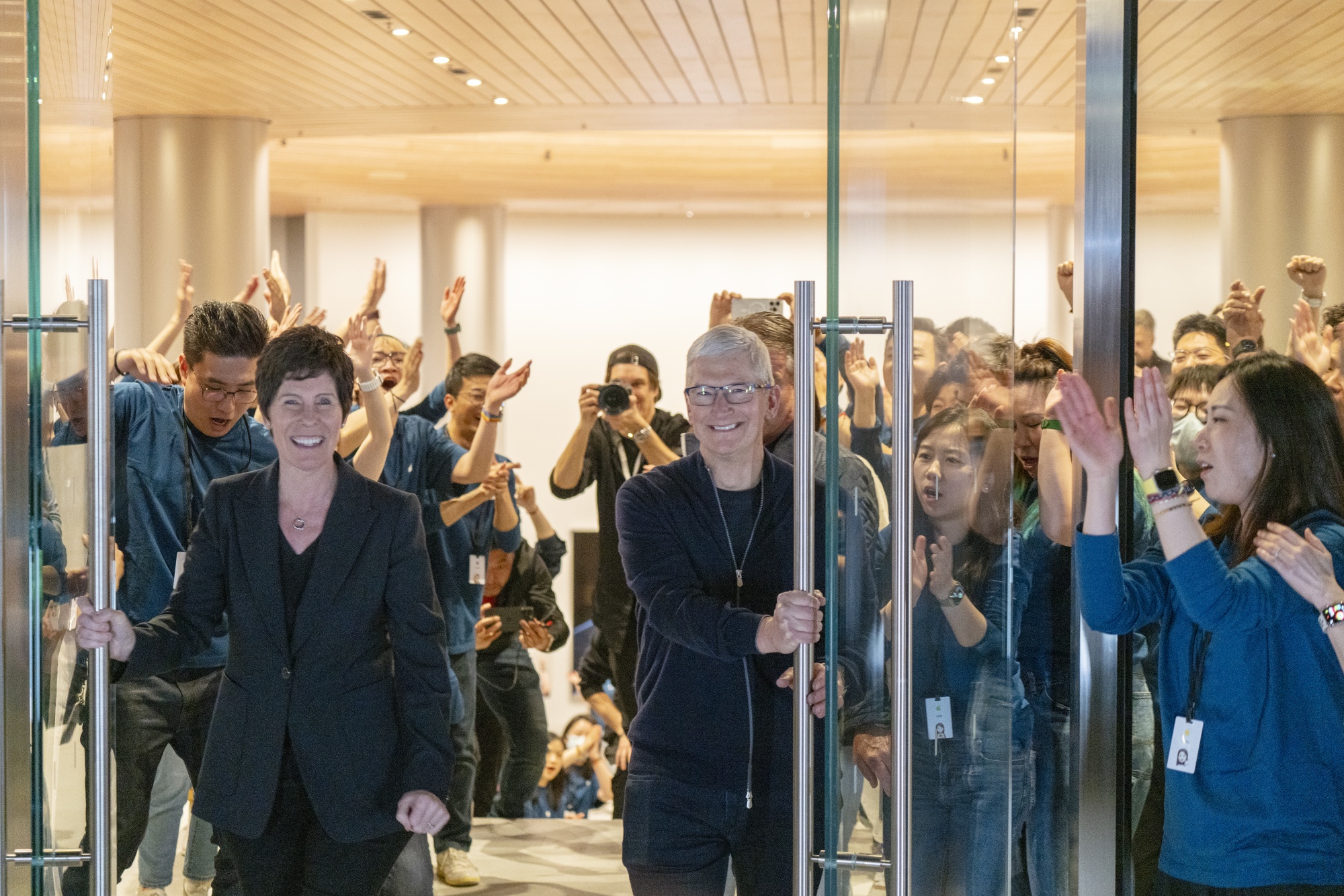 观看:苹果CEO蒂姆·库克和零售主管迪尔德·奥布莱恩周四在上海中心开设了一家宽敞的新店。
