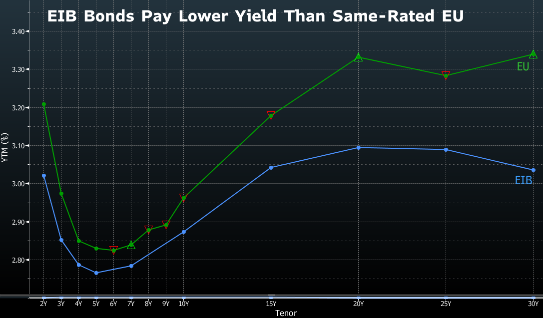 投资者还表示,任何EIB国防债券可能会带来更高的收益率。目前,到期日为2034年的债券收益率为2.9%,而类似的欧盟债券收益率约为3%。但是,如果它们被用于军事目的,根据RBC BlueBay资产管理的高级投资组合经理卡斯帕·亨斯的说法,EIB可能面临比欧盟为相同目的出售的债券高10个基点的溢价。