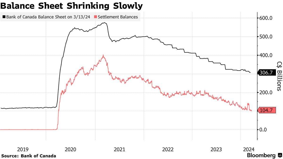 蒂夫·麦克莱姆(Tiff Macklem)担任行长的中央银行已经缩减其资产负债表约两年。其资产已从高峰时的超过5750亿加元降至约3070亿加元,因为它允许其持有的政府债券到期,从而从金融系统中提取流动性。