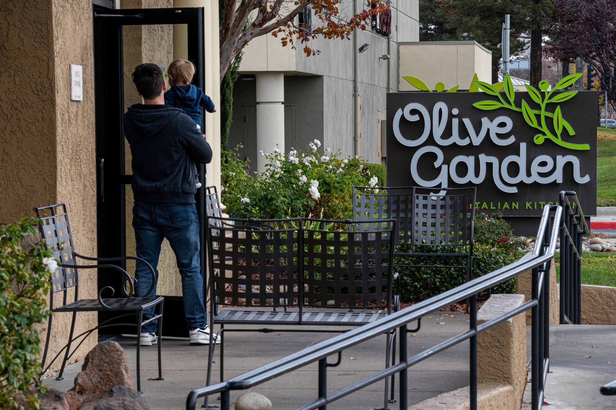 顾客进入加利福尼亚州匹兹堡的橄榄园餐厅。