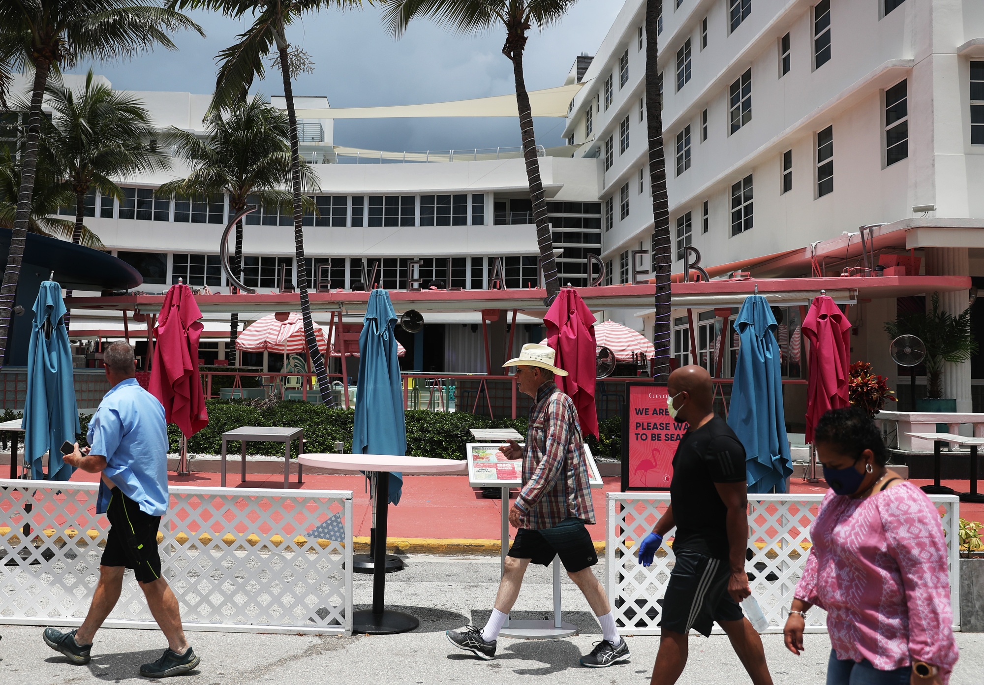 人们走过佛罗里达州迈阿密海滩的克利夫兰南海滩酒店。摄影师:乔·雷德尔/盖蒂图片社迈阿密海滩传奇克利夫兰酒店的业主们提出放弃其狂欢派对的方式,以重塑该市的装饰艺术风格天际线。