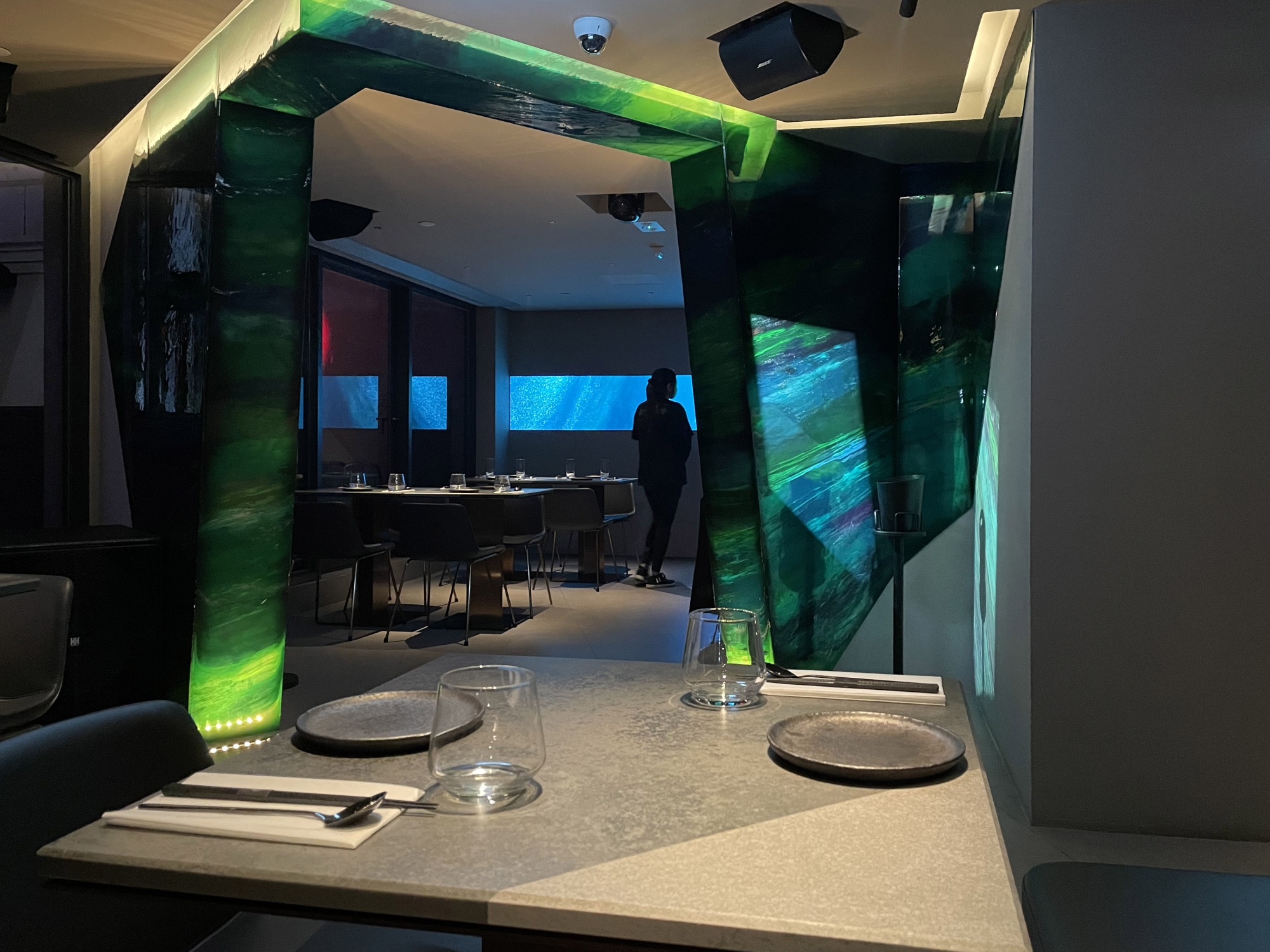 **氛围:**它绝对与中环或苏豪大部分居酒屋感觉不同,那些地方往往拥挤,摆设着旧木长凳和桌子。AOAO的家具简约而深色,而绿色的素净色调使内部主要区域显得严肃而亲密。屋顶宽敞,不断被从紫色到粉红和黄色再到绿色的彩色灯炮照亮 — 有时还会有绿色。我们被告知周末户外有DJ演出。