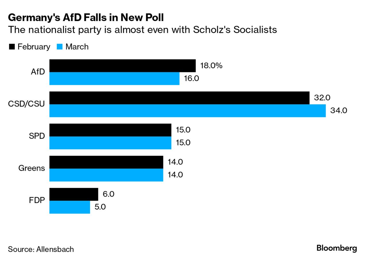 德国新选择党提倡驱逐移民,并曾考虑退出欧盟,自2月以来下滑了两个百分点,降至16%,几乎与总理奥拉夫·肖尔茨领导的社会民主党持平,后者为15%,根据周四公布的全国Allensbach民意调查。基民盟领导的反对派扩大了领先优势,增加了两个百分点,达到34%。