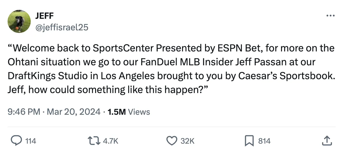 我不是大联盟棒球迷,但大谷翔平的博彩炸弹应该会引起即使是最随意的球迷的兴趣。而我所说的,就是那些纯粹为了热狗而来的我们。以下是我对这个故事的快速而粗略的版本: