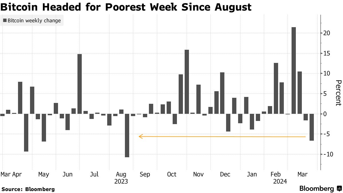比特币从历史最高点回落超过10%,因对新兴现货比特币交易所交易基金的热情有所减弱,使得这种加密货币正以自8月以来最糟糕的一周的速度前进。