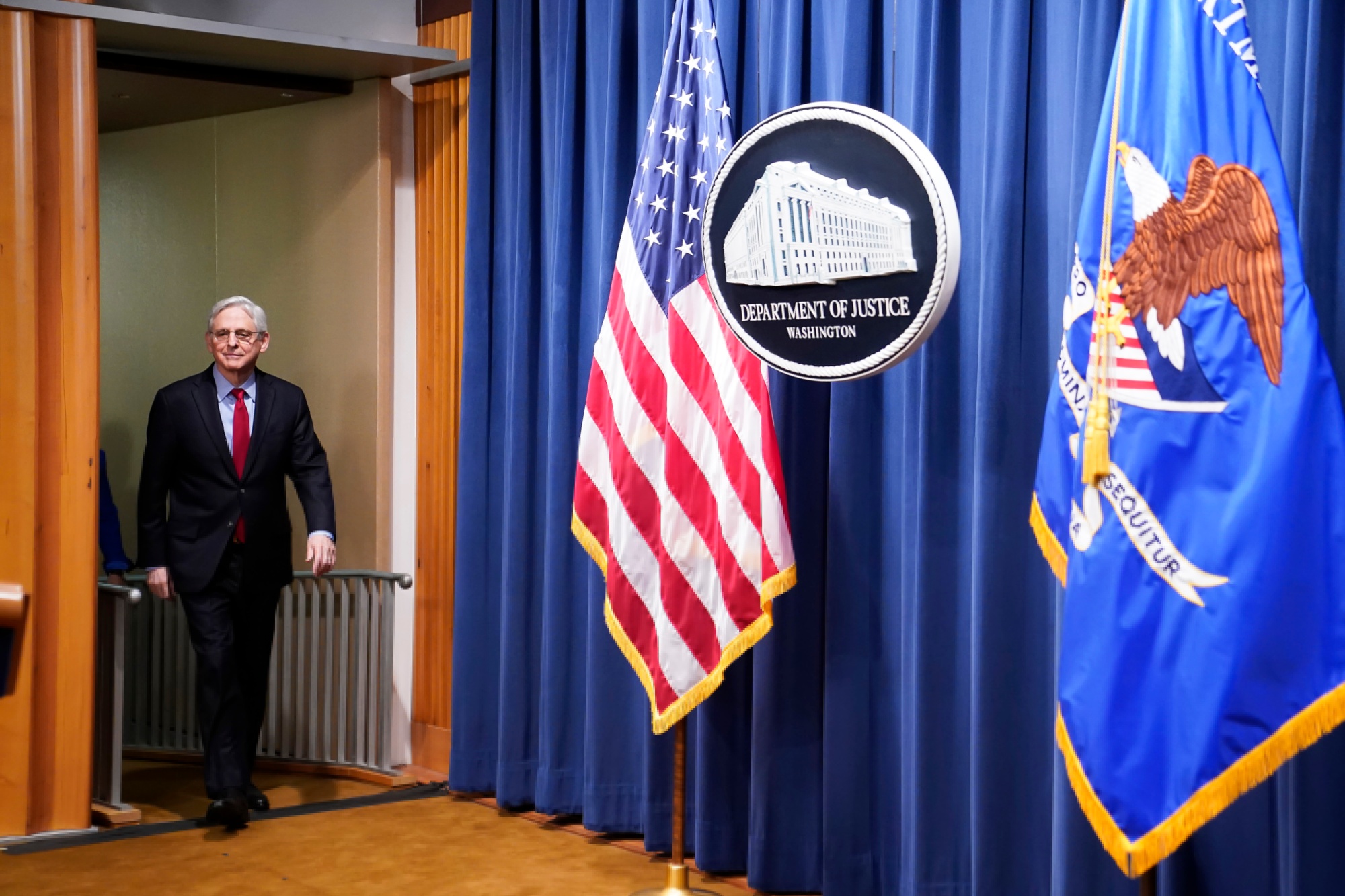 美国司法部长梅里克·加兰德周四抵达华盛顿司法部举行新闻发布会。美国司法部和16名检察官起诉苹果,指控这家iPhone制造商违反反垄断法,阻止竞争对手访问其设备的硬件和软件功能。