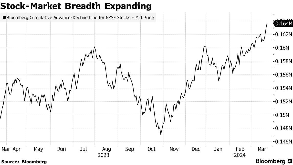 尽管如此,总体上市场广度继续扩大,他补充道,指出纽约证券交易所股票的累积涨跌线现在接近创下新的历史高点。