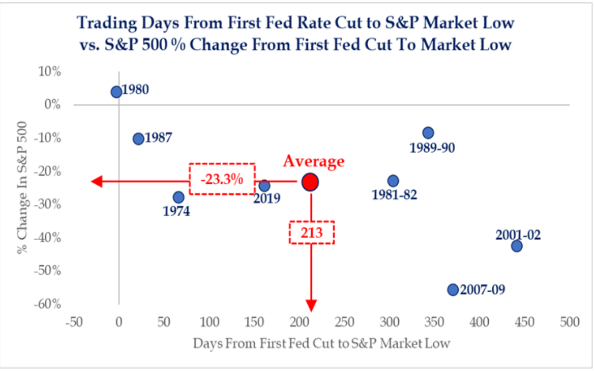 他指出,自最后一次美联储收紧政策到第一次降息之间的100天内,S&P 500平均上涨超过5%。然而,在第一次降息后的200天内,整个市场的低谷超过了23%的跌幅。