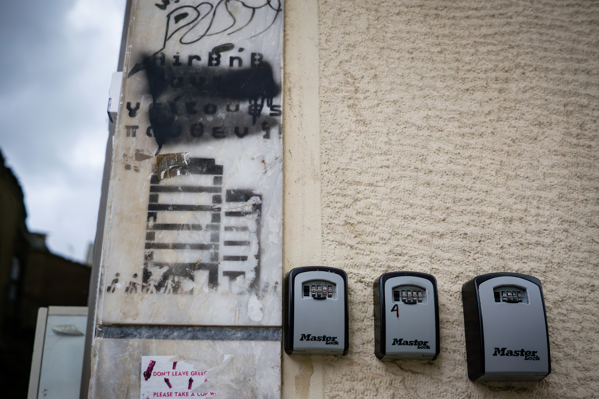 Koukaki区涂有“到处都是Airbnb,邻居却不见”的涂鸦旁的钥匙保险箱。摄影师:Ioana Epure/Bloomberg与此同时,一些分析师认为,不久之后,房价飙升可能会触及顶峰。Piraeus在一份1月份发布的报告中指出,过热的市场已经将住宅房地产价格推高到了无法证明的水平,并观察到“明显的疲劳迹象”开始显现。分析师写道,这可能会引发“周期的下一阶段”,即“高价伴随着交易/购买量的下降”。