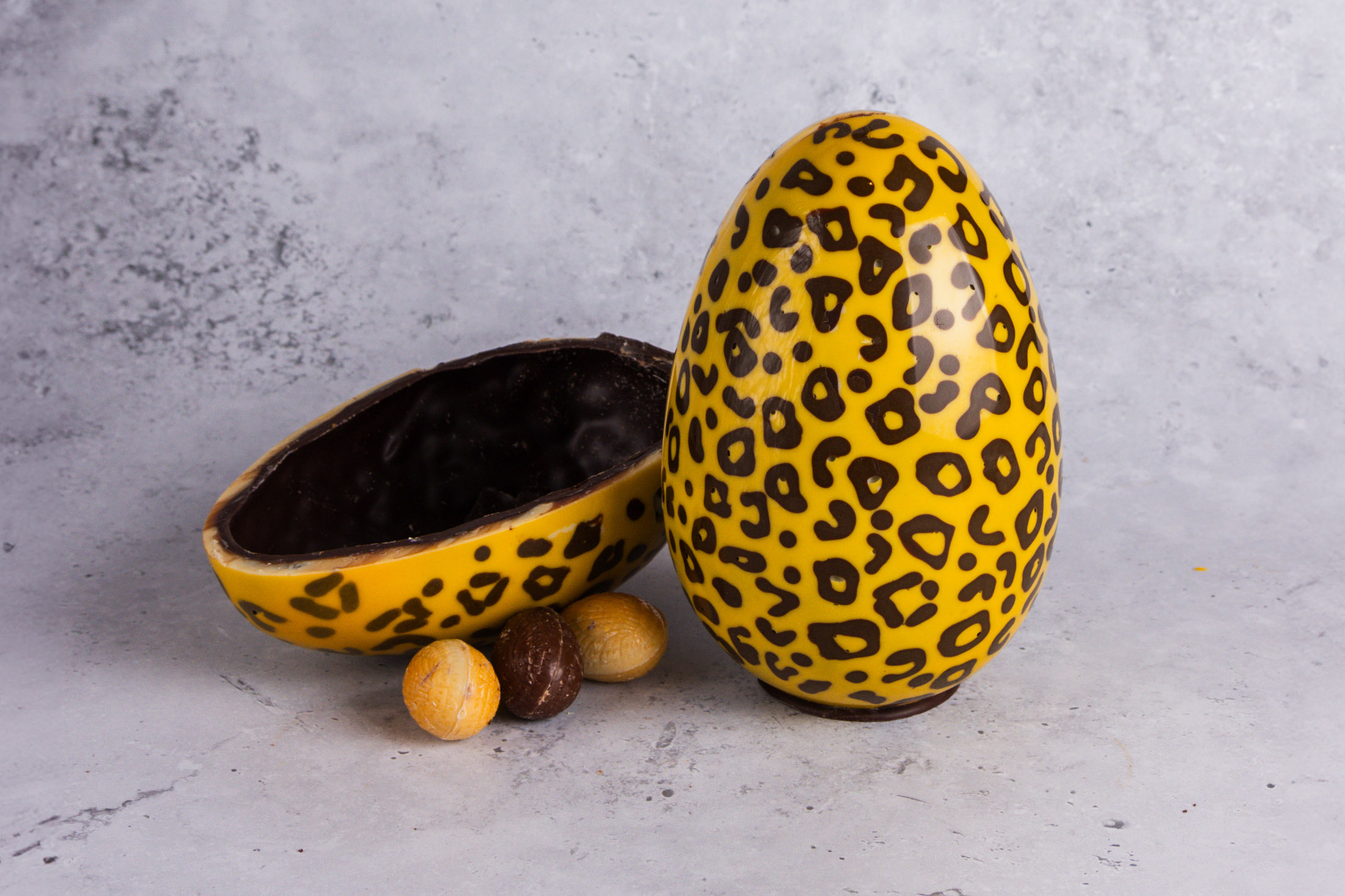 豹纹外观由意大利白巧克力覆盖着一层Valrhona 55%黑巧克力,提供了甜味和苦味的混合口感。它最传统的一点是里面:隐藏着一些额外的巧克力惊喜,小蛋中填满了不同类型的夹心巧克力。