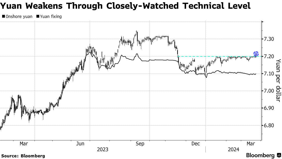 - 人民币在四个月内被保持在紧缩的控制中,但现在迹象表明中国当局准备允许货币贬值。今天,在岸人民币兑美元跌破7.20。