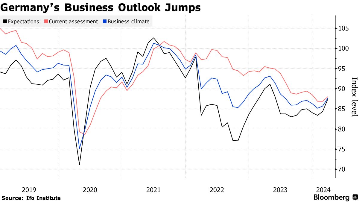 由Ifo研究所发布的预期指数从上个月的修订后的84.4上升到3月的87.5。这是自2023年5月以来的最高水平,超过了彭博调查中的84.7的中位预测。当前状况指数也比预期上升。
