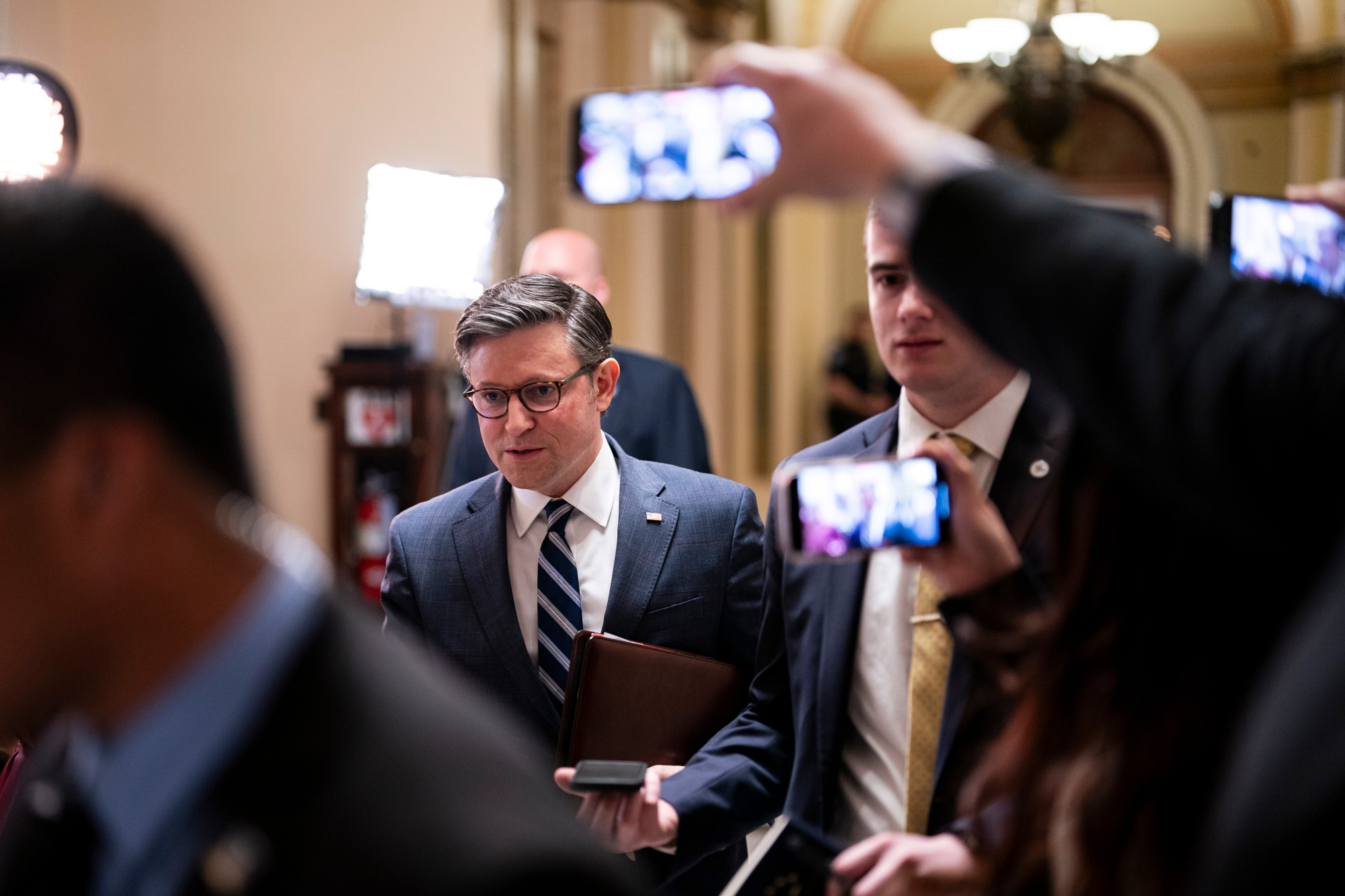 众议院议长迈克·约翰逊摄影师:阿尔·德拉戈/彭博社格林提出的罢免约翰逊的决议需要获得所有众议院成员投票和不投票“出席”的简单多数才能成功。如果所有民主党人投票罢免议长,格林只需要几位共和党同僚加入他们。