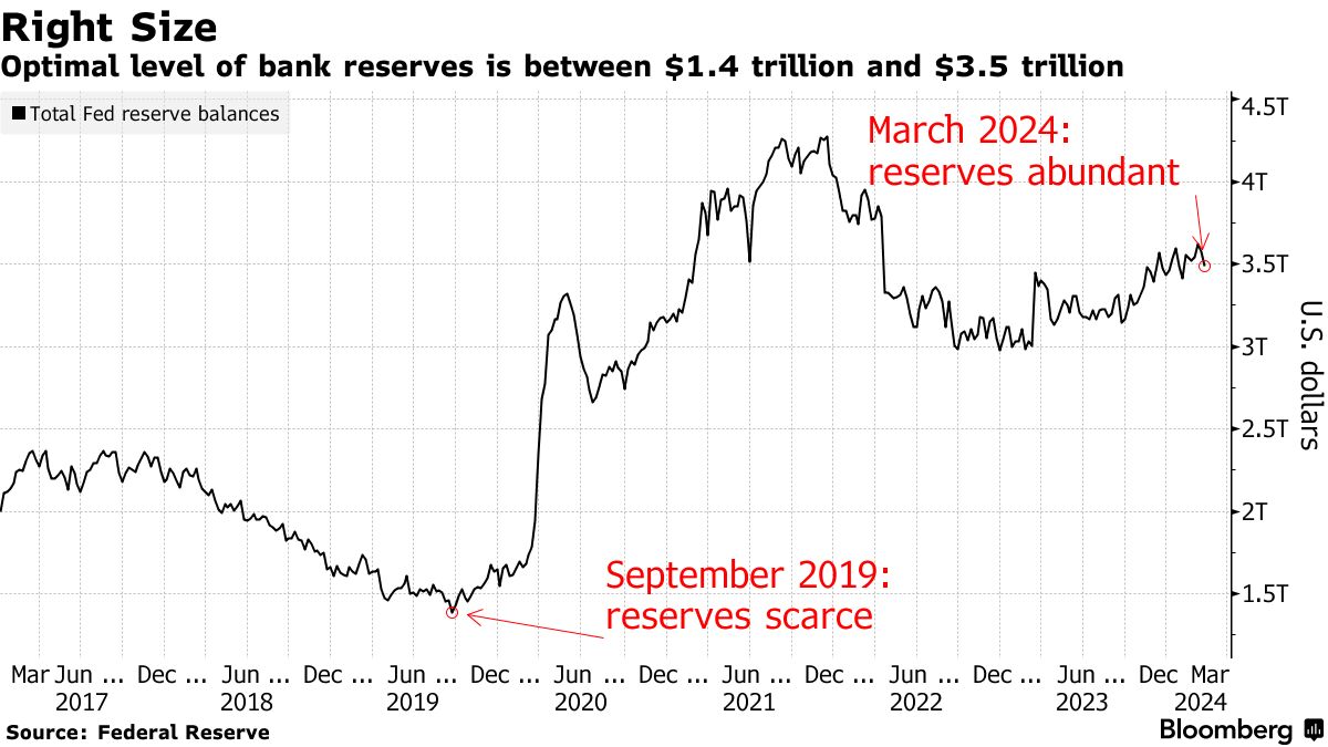 银行准备金是机构存放在美联储以满足意外需求的现金,目前为3.5万亿美元。决策者将这一水平描述为充裕,并且他们的目标是充足,鲍威尔在会后新闻发布会上 说,将其描述为“略少于”充裕。