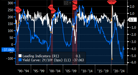 瞧!这是倒挂收益曲线之后第二受欢迎的衰退指标。这是美国会议委员会领先经济指标,目前…并没有真正预示即将到来的衰退。